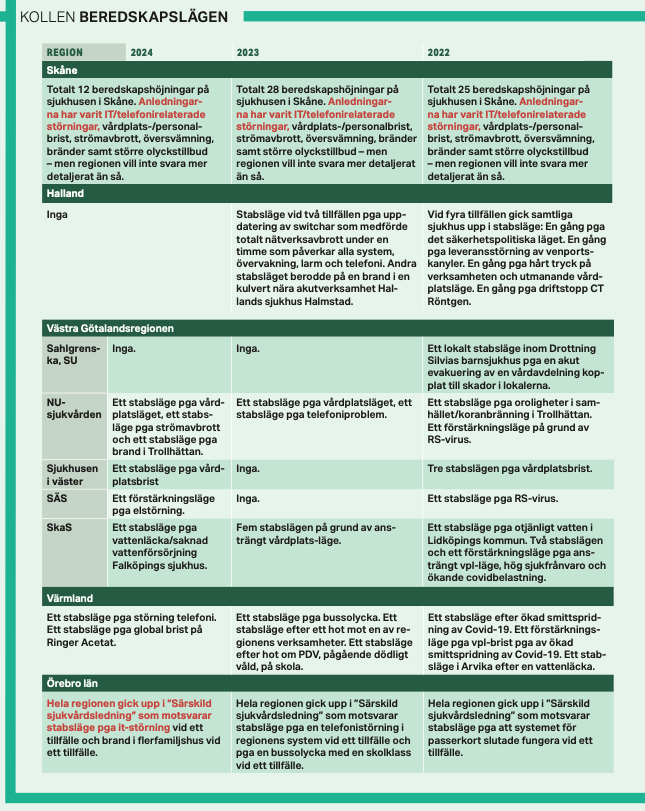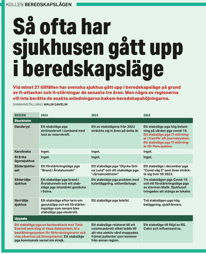 Vid minst 27 tillfällen har svenska sjukhus tvingats gå upp i beredskapsläge på grund av it-attacker och it-störningar de senaste tre åren, visar Sjukhusläkarens granskning.