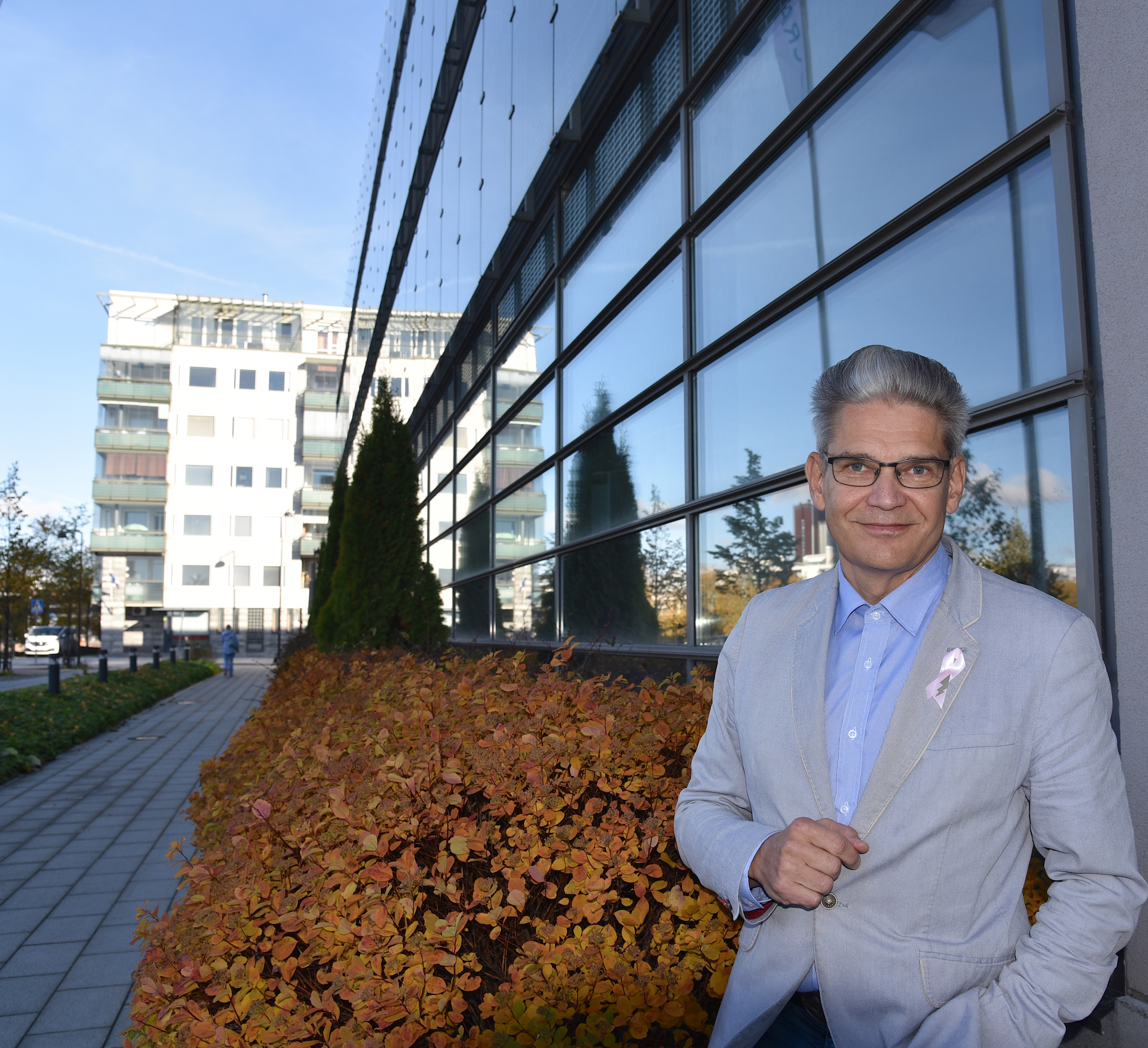Timo Joensuu, specialist i cancersjukdomar och en av sjukhuset Docrates grundare, blickar stolt upp mot sjukhusets glasfasad.