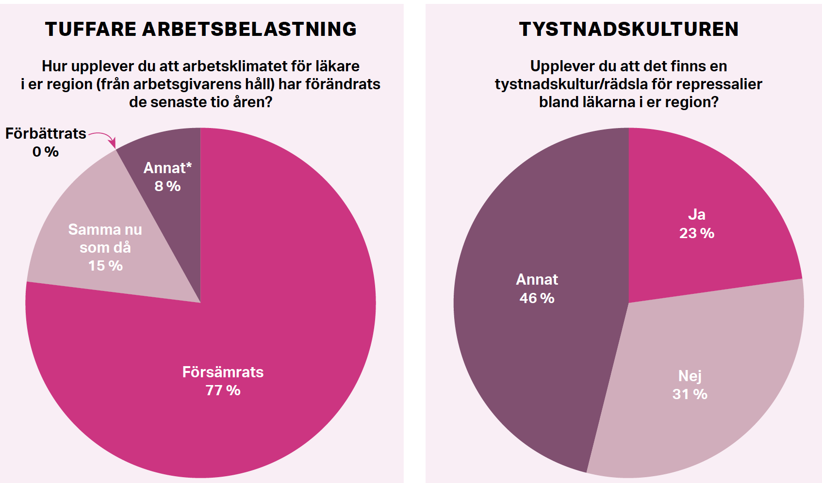 I Sjukhusläkarens enkät till läkarföreningarnas ordföranden vittnar många också om att det finns en rädsla bland läkarna, primärt de yngre, att säga vad de tycker. Bland annat beskriver en av ordförandena att en del kolleger slår knut på sig själva och ”hjälper” arbetsgivaren att bryta mot avtal eftersom de är rädda för att deras klinik kan läggas ned om de anses för besvärliga.