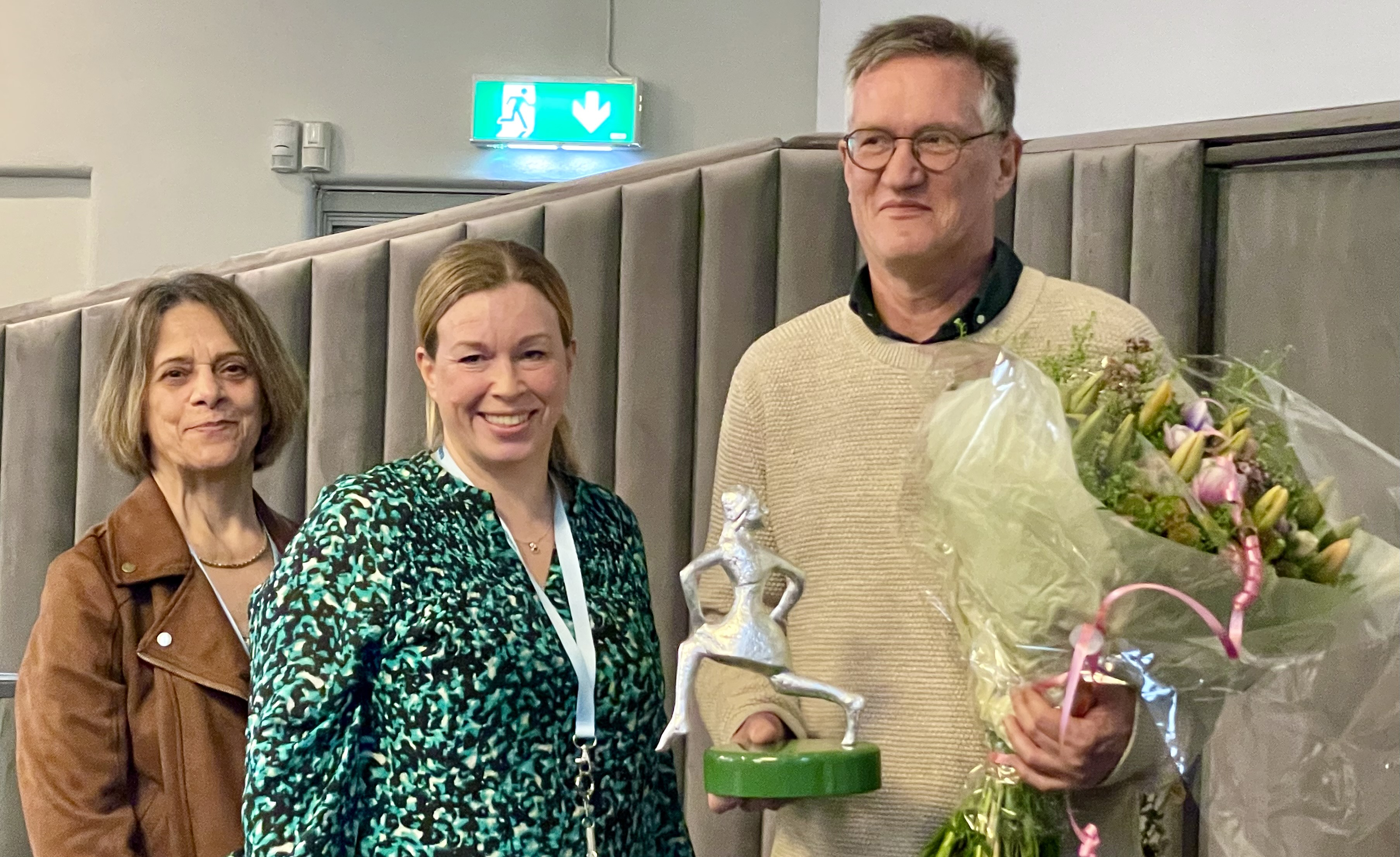 Shokoufeh Manouchehr och Elin Karlsson gratulerar Anders Tegnell till Friska sjukvårdspriset.