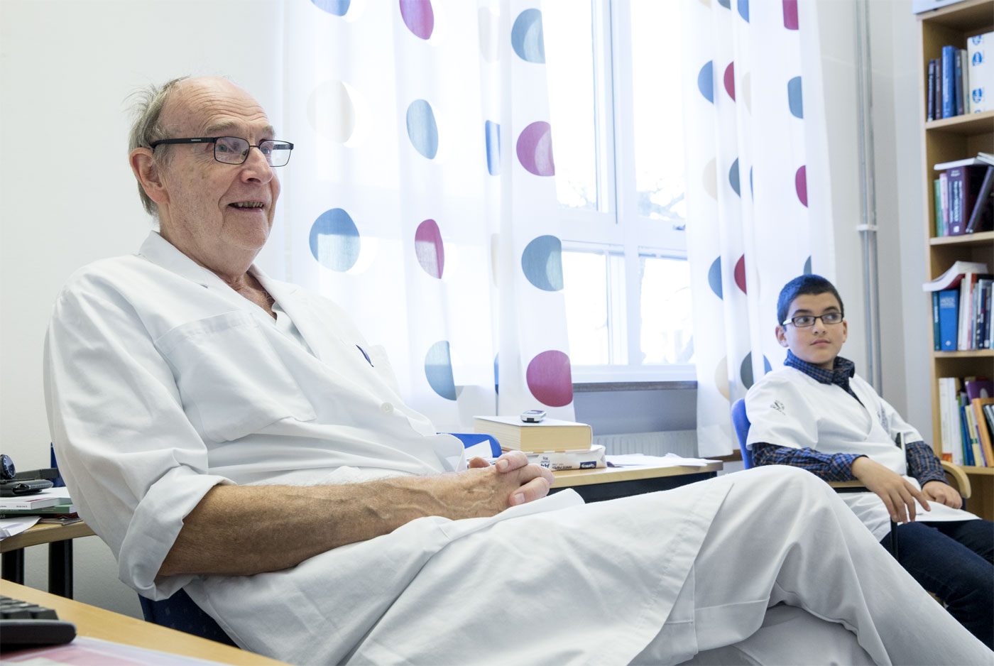 70-årige Gert Malmkvist är en av flera äldre specialister som har sökt sig till Ängelholm just på grund av den goda arbetsmiljön som han beskriver som antidepressiv. ”Förr såg jag varken sol eller måne och blev expert på vänstersidig neurologi för då stod britsen inklämd vid väggen”, säger han. Intill Gert syns en av den kommande generationens doktorer – William Inad som praoar på mottagningen. Foto: André de Loisted