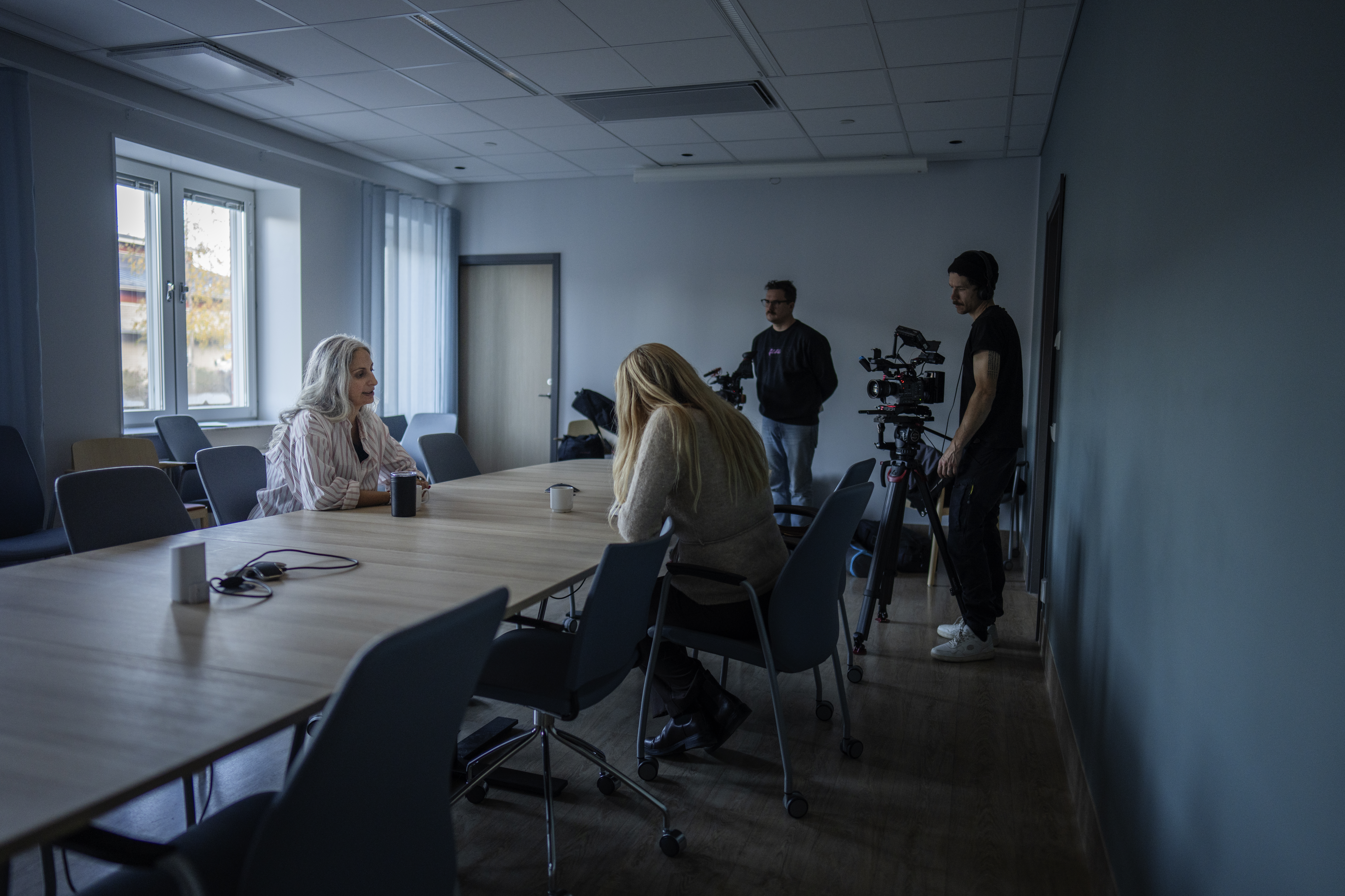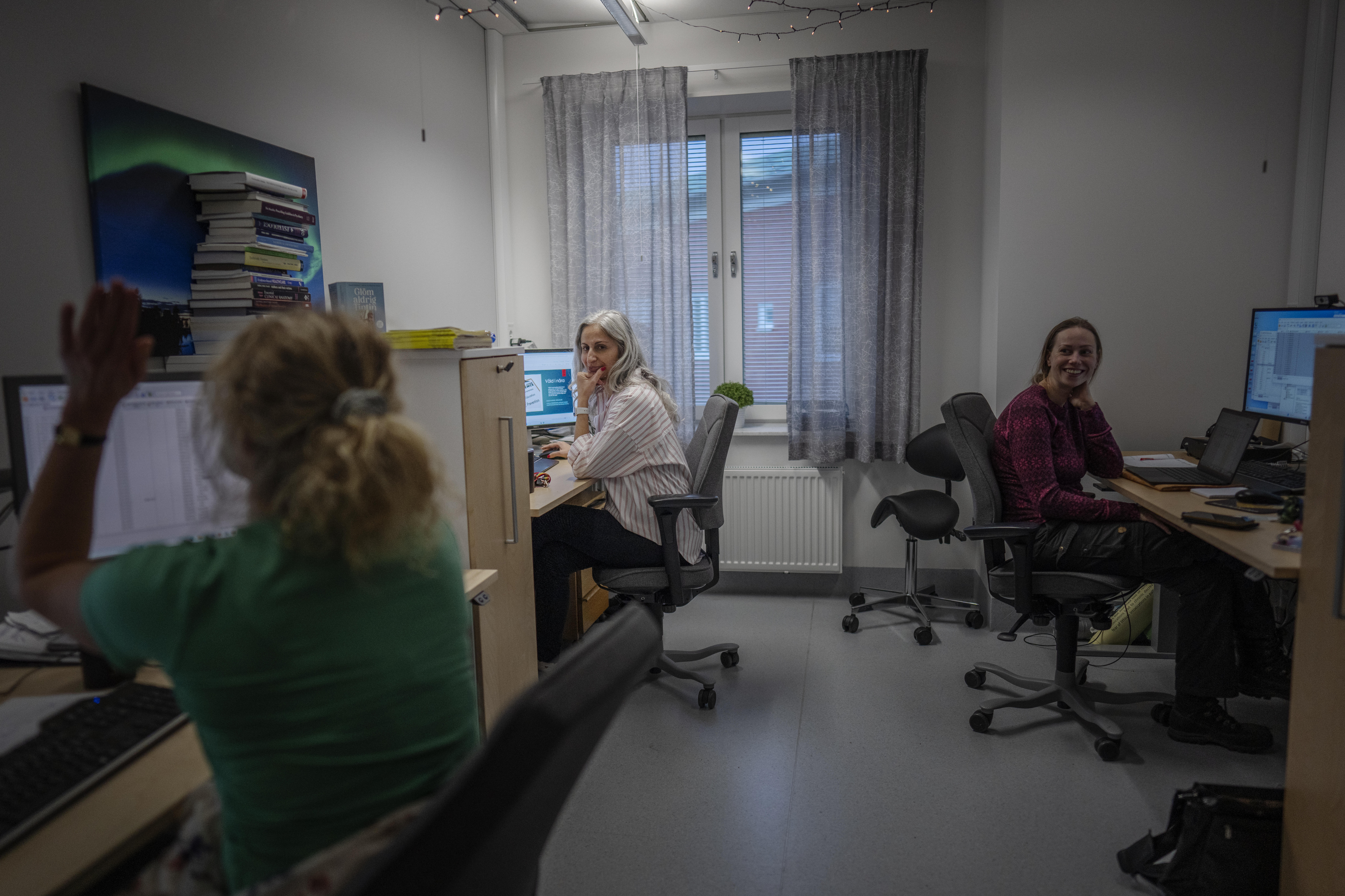Redan fyra månader efter mordet var Sanam Gharaee tillbaka på arbetsplatsen på 25 procent – ett sätt att sakta återfå rutinerna i tillvaron. Här sitter hon i forskarrummet tillsammans med sina båda läkarkollegor Louise och Ingrid.