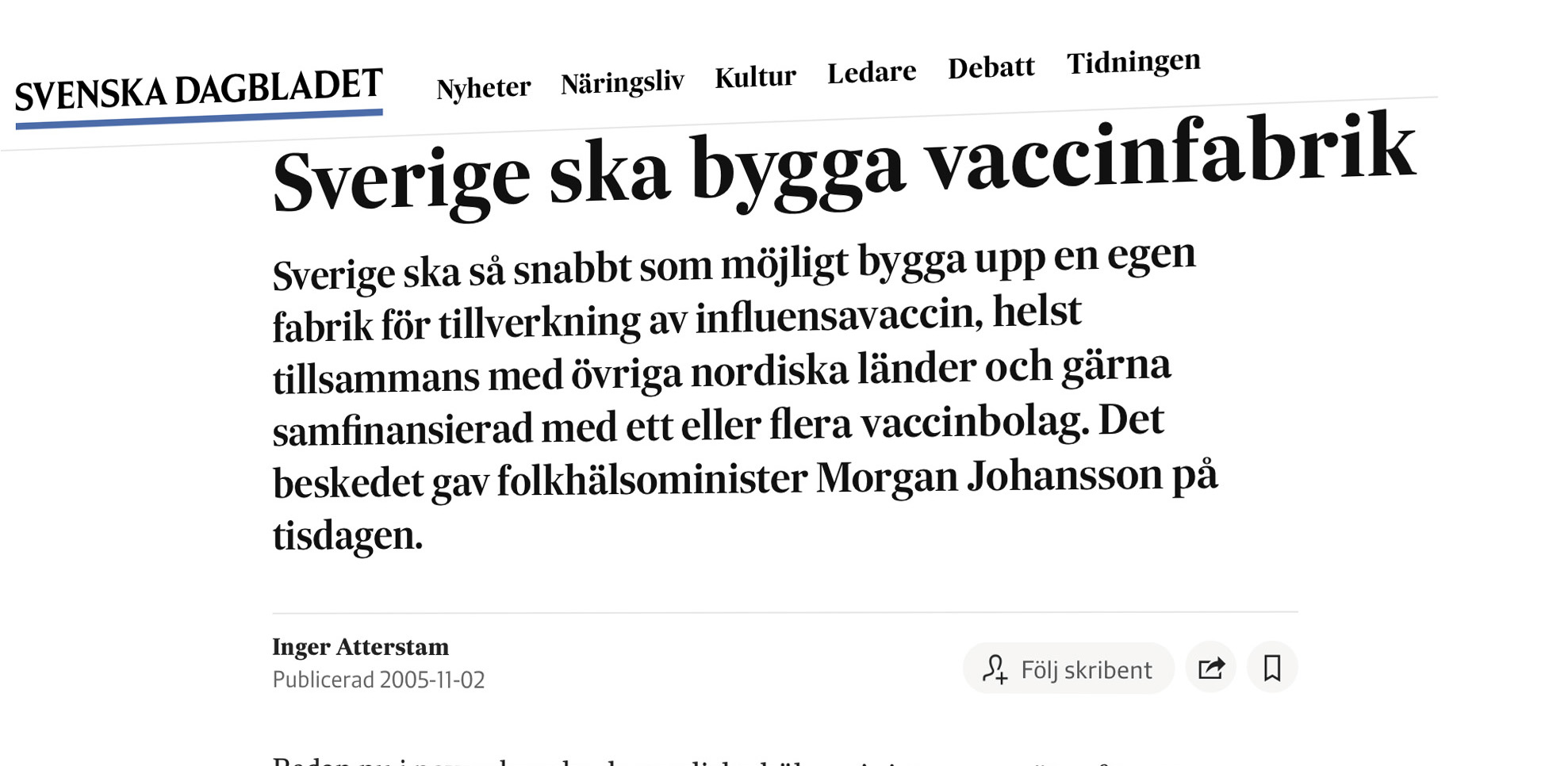 I samband med att fjäderfäinfluensan kom till Sverige blev frågan om svensk vaccintillverkning aktuell. Politikerna tävlade om vem som först skulle få sätta spaden i jorden för att bygga vaccinfabrik. Några politiker, främst folkhälsominister Morgan Johansson (S), ansåg att frågan var angelägen. Från början såg det bra ut. Frågan var inte om vi skulle ha en fabrik eller inte, utan var den skulle ligga. I sann svensk anda av avundsjuka började det ena universitetet och staden efter den andra att dra i sina trådar. När viggarna utanför Oskarshamn slutade dö, dog också frågan om en svensk influensavaccintillverkning.