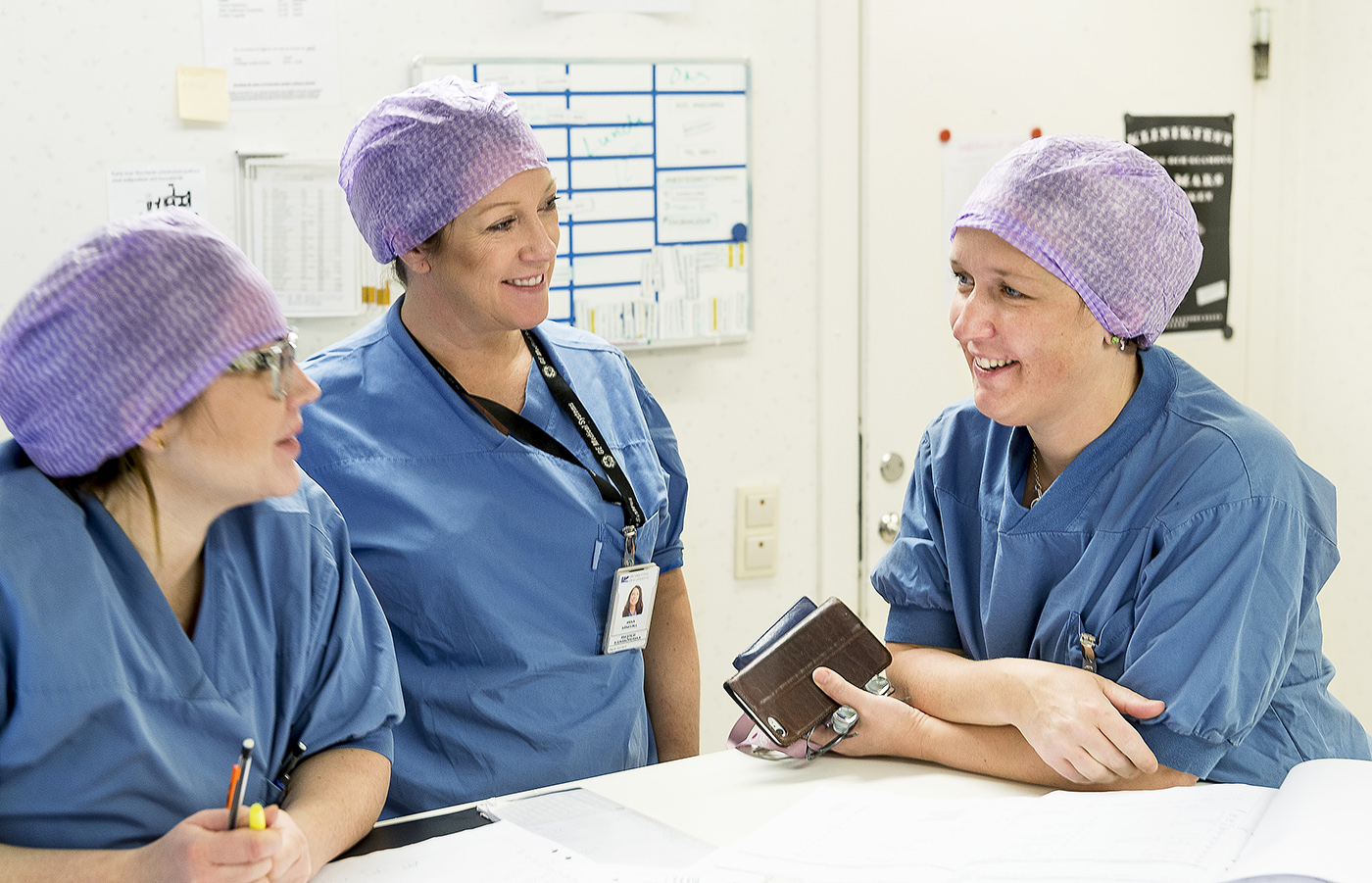 När Malin Sund flyttade till Sverige upplevde hon många kulturkrockar.”I Finland är en ledare en ledare som visar vägen – här ska besluten förankras i grupper och samverkas. Det kan jag tycka tar lite för lång tid ibland. Men samtidigt är det mycket lättsammare på arbetsplatsen här, man skrattar mer på jobbet. Det finns en melankoli i Finland som fortfarande lever kvar”, säger hon – här tillsammans med narkossjuksköterskorna och samordnarna Anna Sånevall och Anna Löfgren. Foto: Mikael Lundgren.