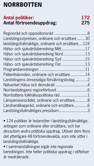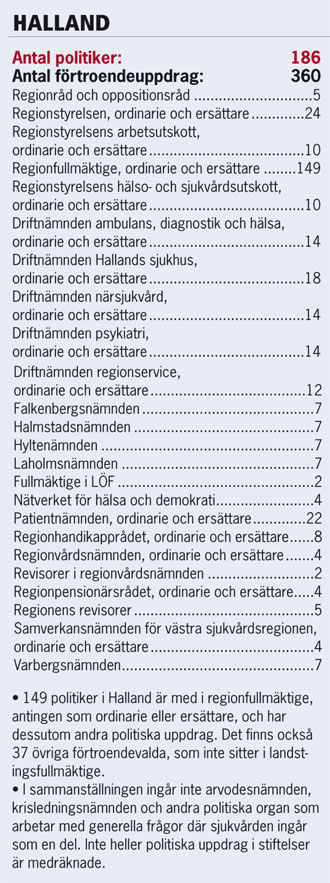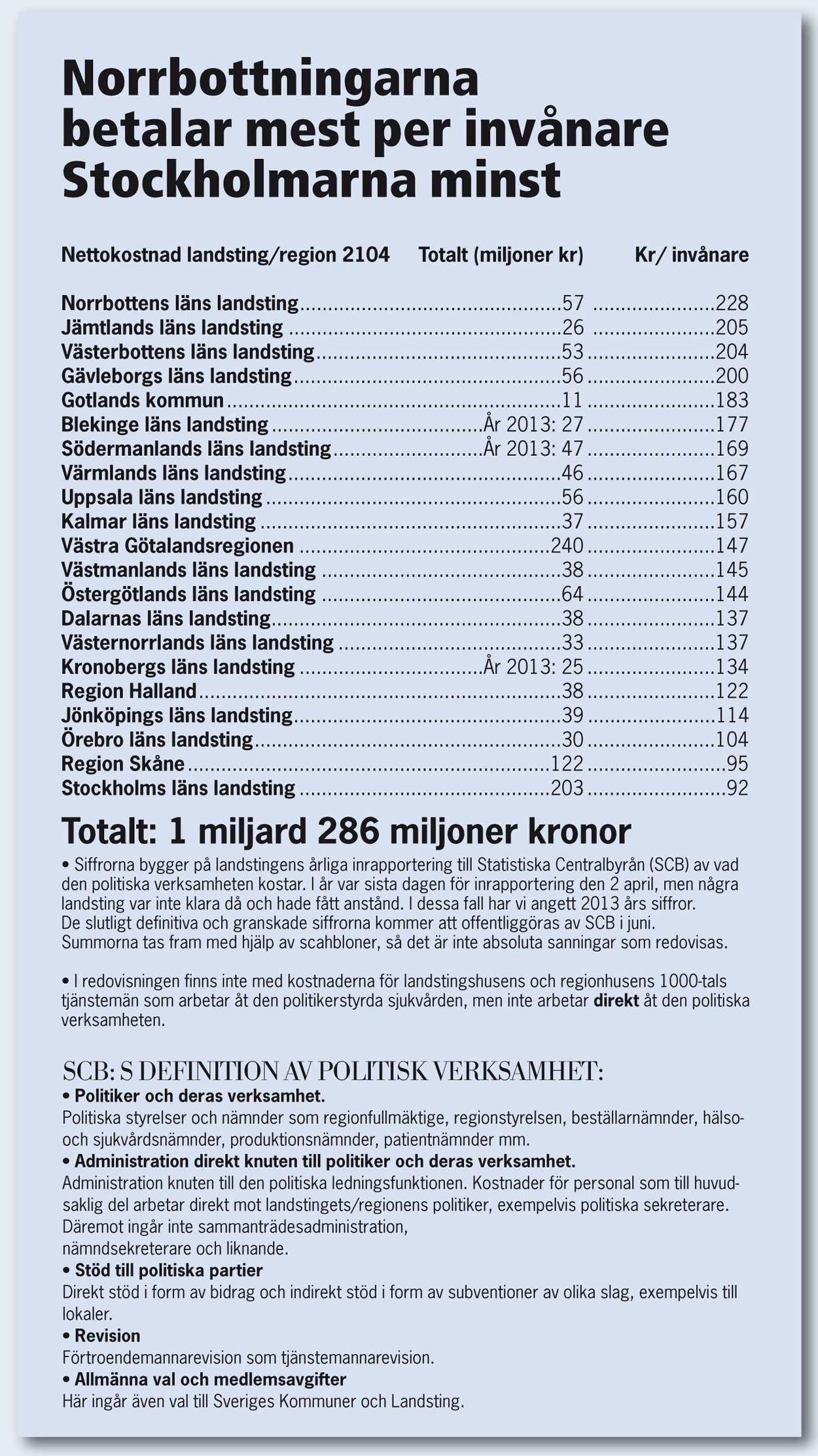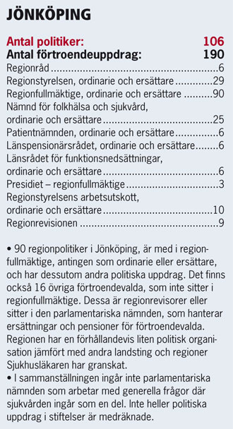 Sjukhusläkaren har kartlagt kostnaderna för Sveriges landstings- och regionpolitiker. Resultatet visar att invånarna betalar mest för politiken i landstingen i norr och stockholmarna betalar minst. Vi har också granskat den politiska organisationen i några av landstingen och regionerna.