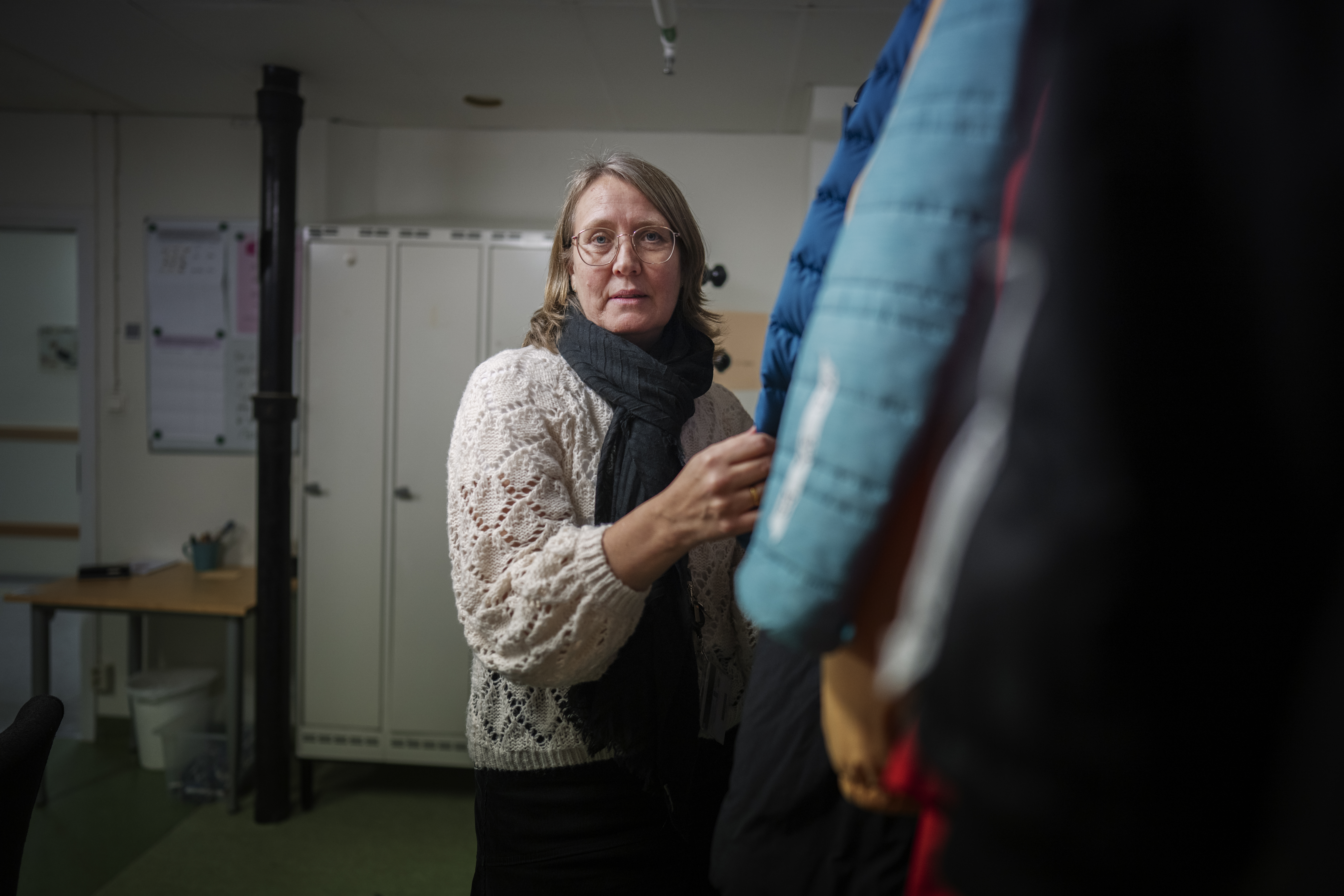Birgitta Westin som är hållbarhetssamordnare visar deras garderob på Södersjukhuset i Stockholm den 31 oktober 2025.