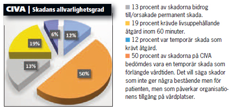 På CIVA granskades 238 journaler från oktober 2012 till september 2013. 94 skador upptäcktes (39 procent). 72 av dem (30 procent) bedömdes som potentiellt undvikbara. Endast ett fåtal av de upptäckta skadorna i journalgranskningen fanns registrerade i avvikelsesystemet Med Control Pro.