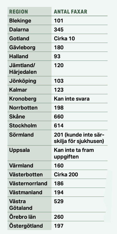 660 aktiva faxar i Region Skåne och 614 i Region Stockholm. Trots att politiker har pratat om att faxen ska avvecklas inom offentlig sektor i flera år finns det fortfarande över 4000 aktiva faxar i landets regioner, visar Sjukhusläkarens granskning.