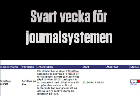 Förra tisdagen låg journalsystemet Take Care nere under 6,5 timmar i Stockholm-Gotland. Även Dalarna drabbades samma dag av ett haveri i Take Care, som inte var relaterat till problemen i Stockholm, under cirka två timmar.