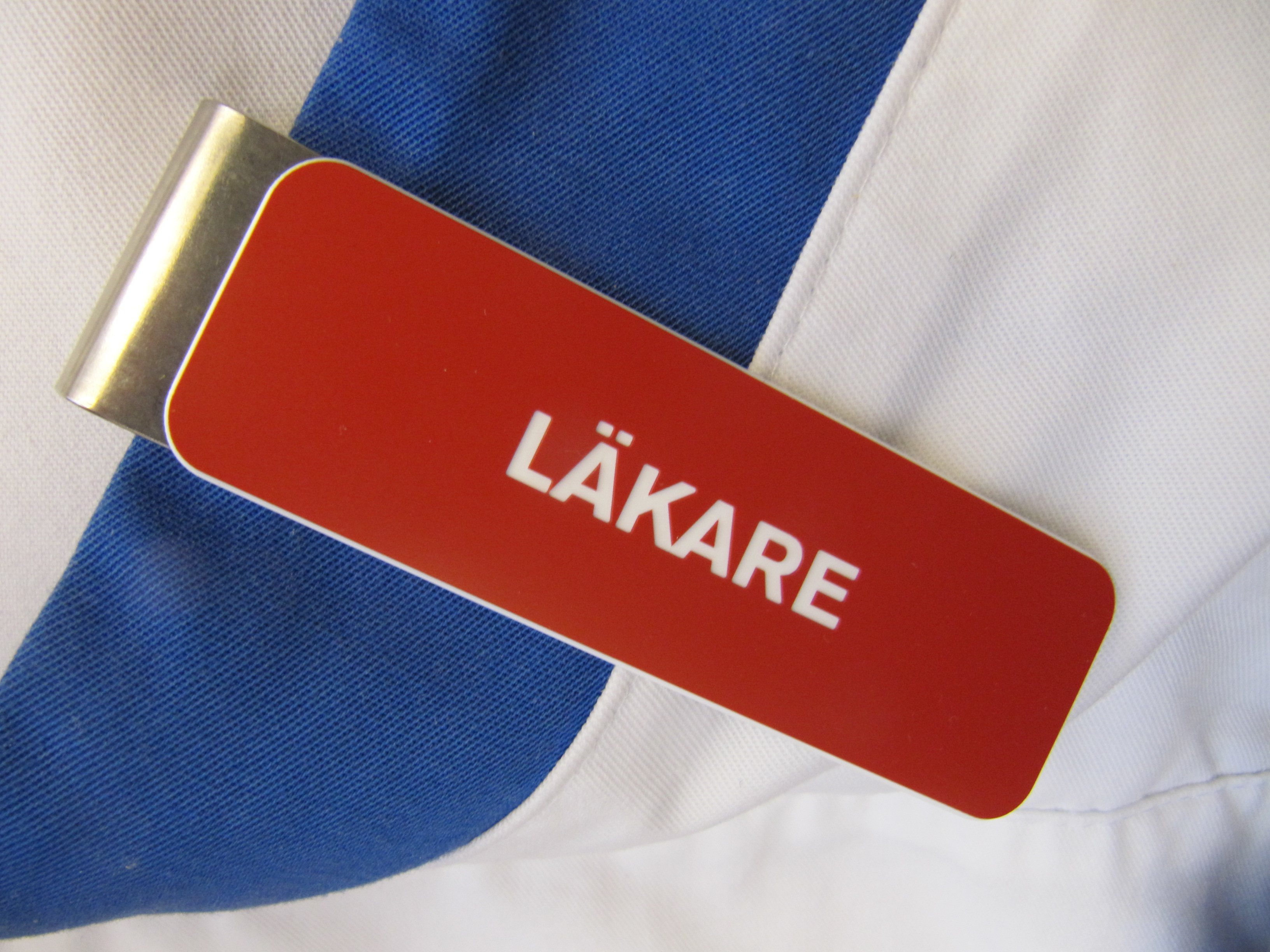 I förslaget från läkarförbundets arbetslivsgrupp föreslås att ordet LÄKARE trycks eller broderas ovanför bröstfickan eftersom löstagbara brickor måhända kommer att hamna i en och annan tvättsäck eller väljas bort av vissa. På Akademiska har man inte tagit fram klädesplagg utifrån funktion men det är ändå en liten facklig seger med bättre identifikation av läkare.