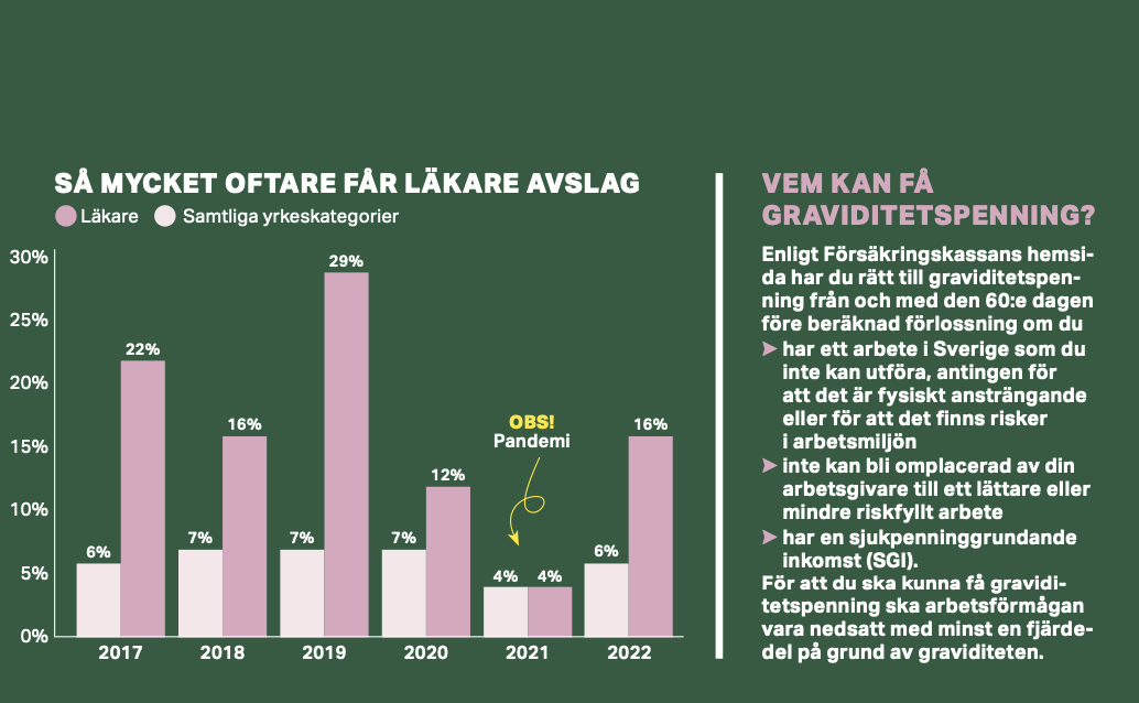 Din ansökan om graviditetspenning beviljas ej – det beskedet möts läkare av betydligt oftare än befolkningen i stort. När Sjukhusläkaren begärde ut statistik på hur många ansökningar om graviditetspenning som hade beviljats respektive fått avslag under de senaste sex åren var trenden tydlig: en läkare som upplever sin arbetsförmåga nedsatt på grund av graviditeten får betydligt oftare avslag på graviditetspenning än gemene man. Andelen avslag för läkarna låg nämligen i genomsnitt på 14 procent under sexårsperioden medan motsvarande siffra för befolkningen i stort låg på 6 procent.