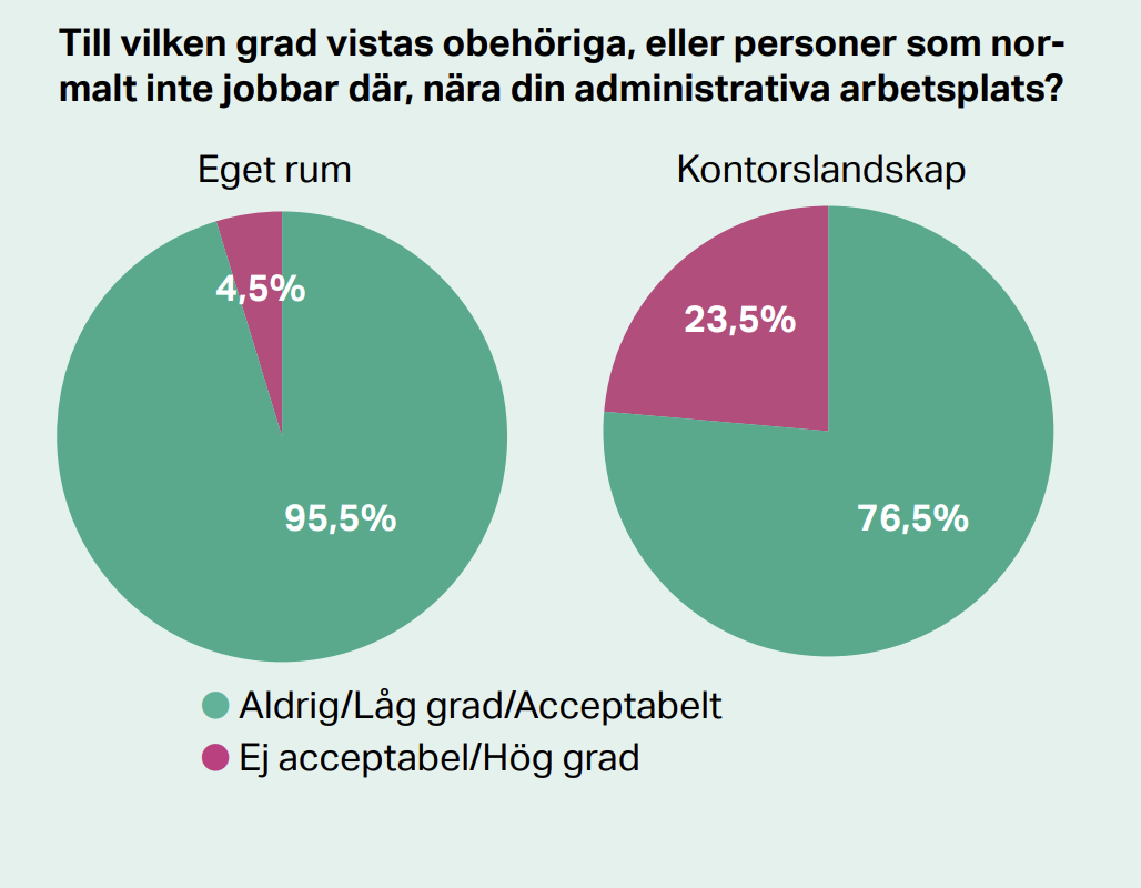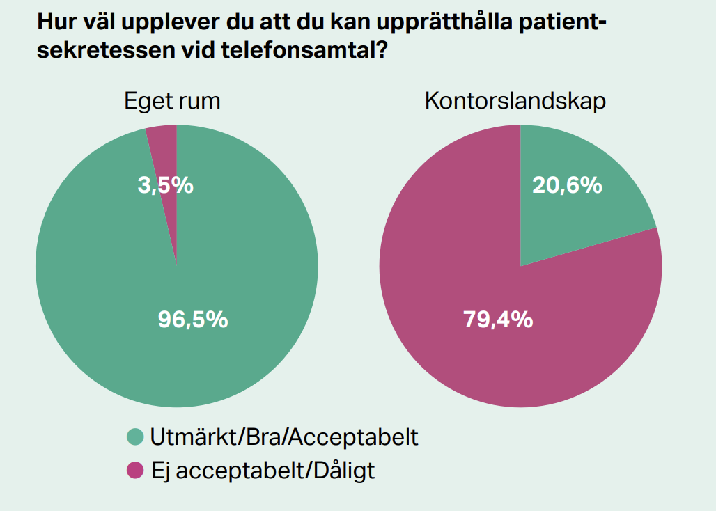 – De gömmer sig bakom argument som att de som vistas i lokalerna ändå omfattas av sekretessen de också. Men i den här enkäten vittnar läkarna om att det faktiskt vistas en hel del obehöriga i de här öppna kontorslandskapen, vilket inte är konstigt när vi pratar om över 100 personer på en och samma yta som på olika sätt interagerar med sin omvärld. Det kan till exempel vara gäster till kollegor och chefer som sitter och skrattar åt ett Youtubeklipp samtidigt som man själv behöver lämna ett tufft besked till en patient via telefon. Av läkarna som sitter i öppet kontorslandskap svarade 23,2 % att det vistas obehöriga i lokalerna i ej acceptabel eller hög grad. Siffrorna följer en tydlig logik. Ju fler man sitter tillsammans desto större risk för detta.