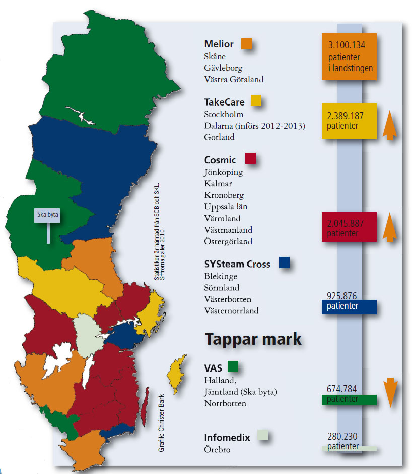 Inom sjukhusvården är det idag sex journalsystem som har greppet om den svenska marknaden: TakeCare, Cosmic, SYSteam Cross, Melior, VAS och Infomedix.