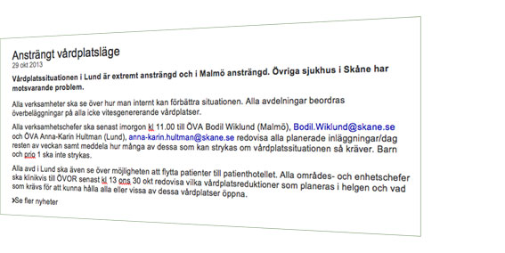 Alla verksamhetschefer beordras att se hur många inläggningar som kan strykas per dag resten av veckan och i Lund uppmanas alla avdelningar att flytta patienter till patienthotellet.