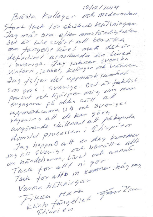 I ett brev som läkaren Margareta Sidenvall fick med sig från FikruMaru tackar han kollegorna i Sverige för deras stöd. Han skriver han att han följer den uppmärksamhet hans fall väckt och att alla påtryckningar – på UD och regeringen för att agera kan göra avgörande skillnad för att påskynda domstolsprocessen i Etiopien.