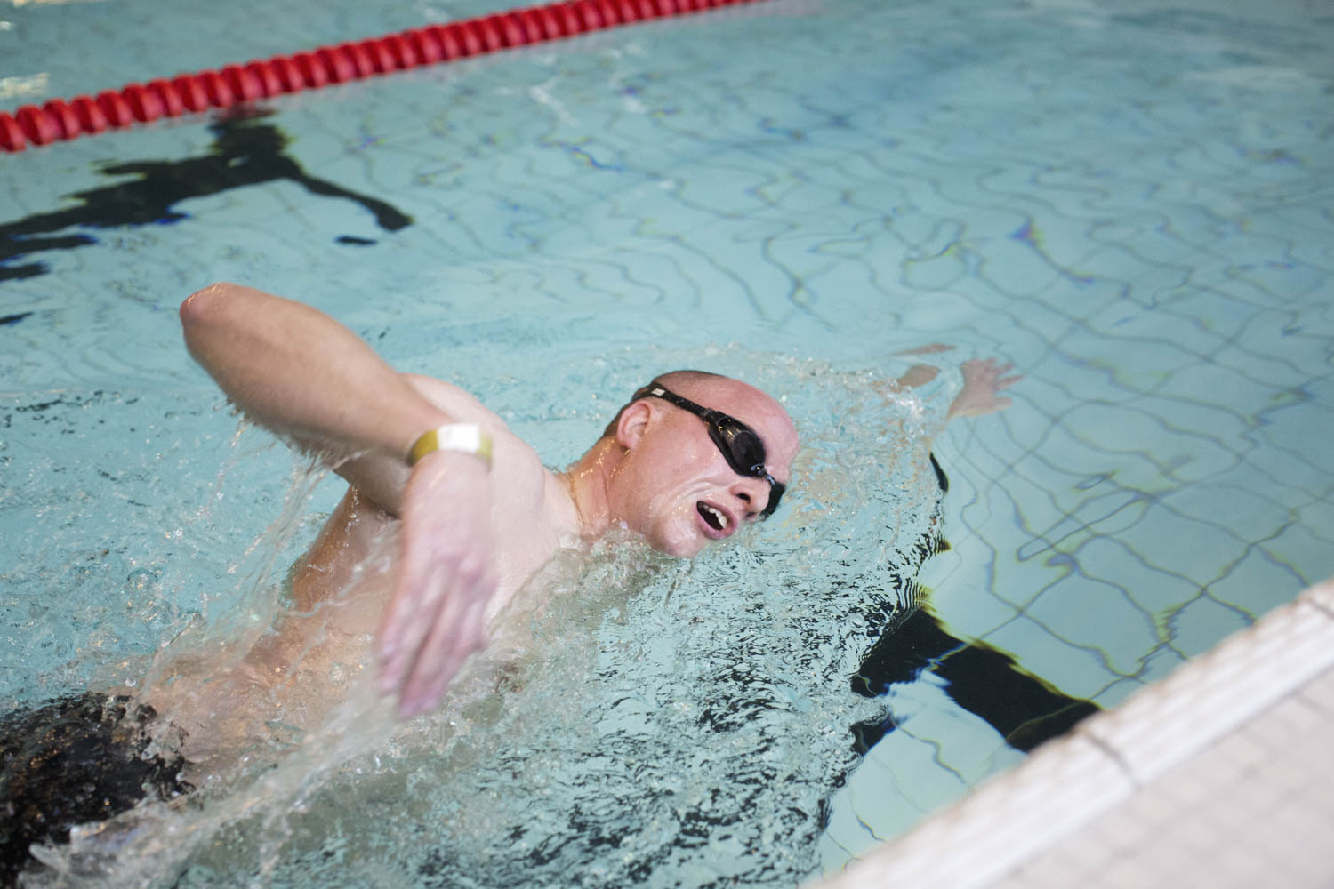 Han dyker ner under vattnet igen, tar spjärn mot kaklet och skjuter ifrån. När han kommer upp till ytan igen tar han sig fram med samma metodiska och lugna rörelser. Att simma är hans sätt att rensa tankarna efter jobbet. Koncentrationen som krävs för att få till rörelserna tar över och ”då finns det inte plats för andra tankar i huvudet”.