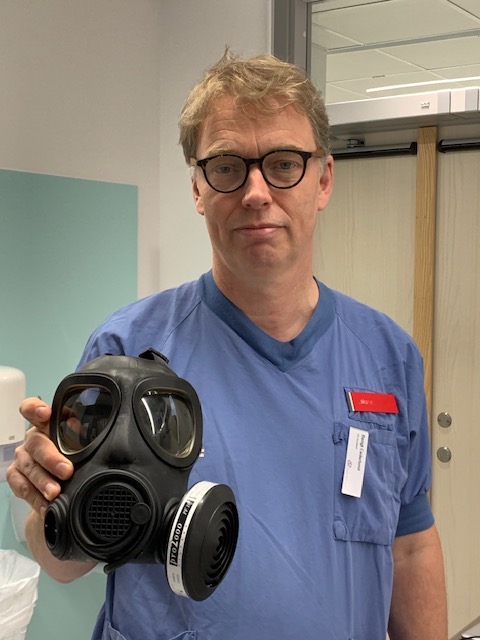 Bengt Cederlund, tillförordnad chefläkare vid Södertälje sjukhus, visar upp skyddsmask 90.