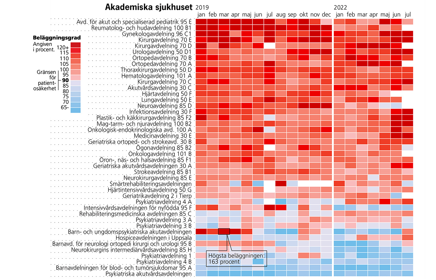 Under 2019 hade två av tre somatiska vårdavdelningar på Akademiska sjukhuset inte en enda månad där beläggningsgraden var under 99 procent i genomsnitt.