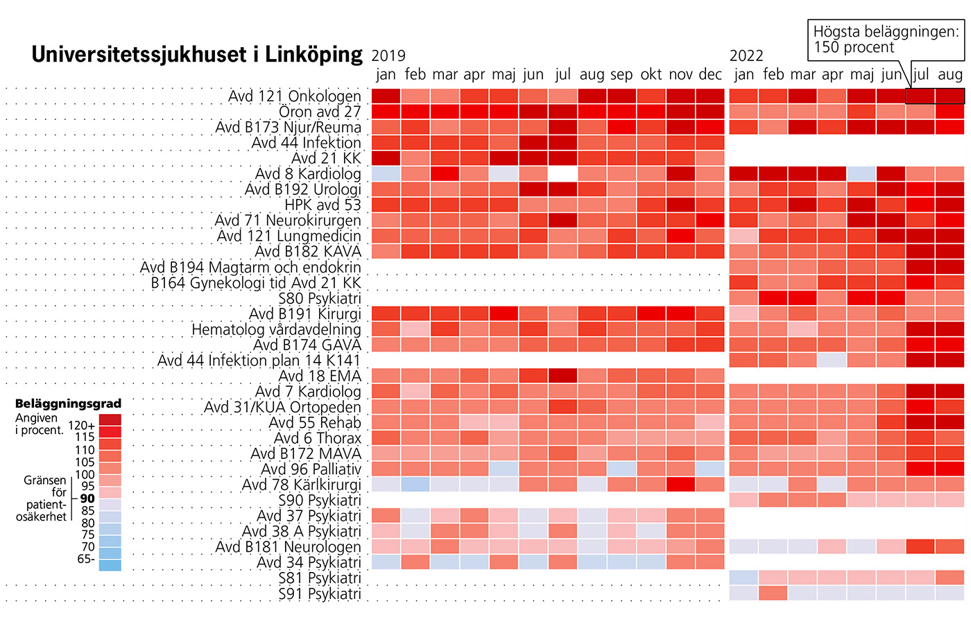 Statistiken visar också att under de första åtta månaderna under 2022 har situationen försämrats ytterligare. Samtliga vårdavdelningar hade under juli – augusti 2022 högre beläggningsgrader i genomsnitt jämfört med 2019 och trycket på onkologen var fortsatt stort. Under årets första åtta månader var beläggningsgraderna 110-110-120-109-120-143-150 och 150 procents beläggning.