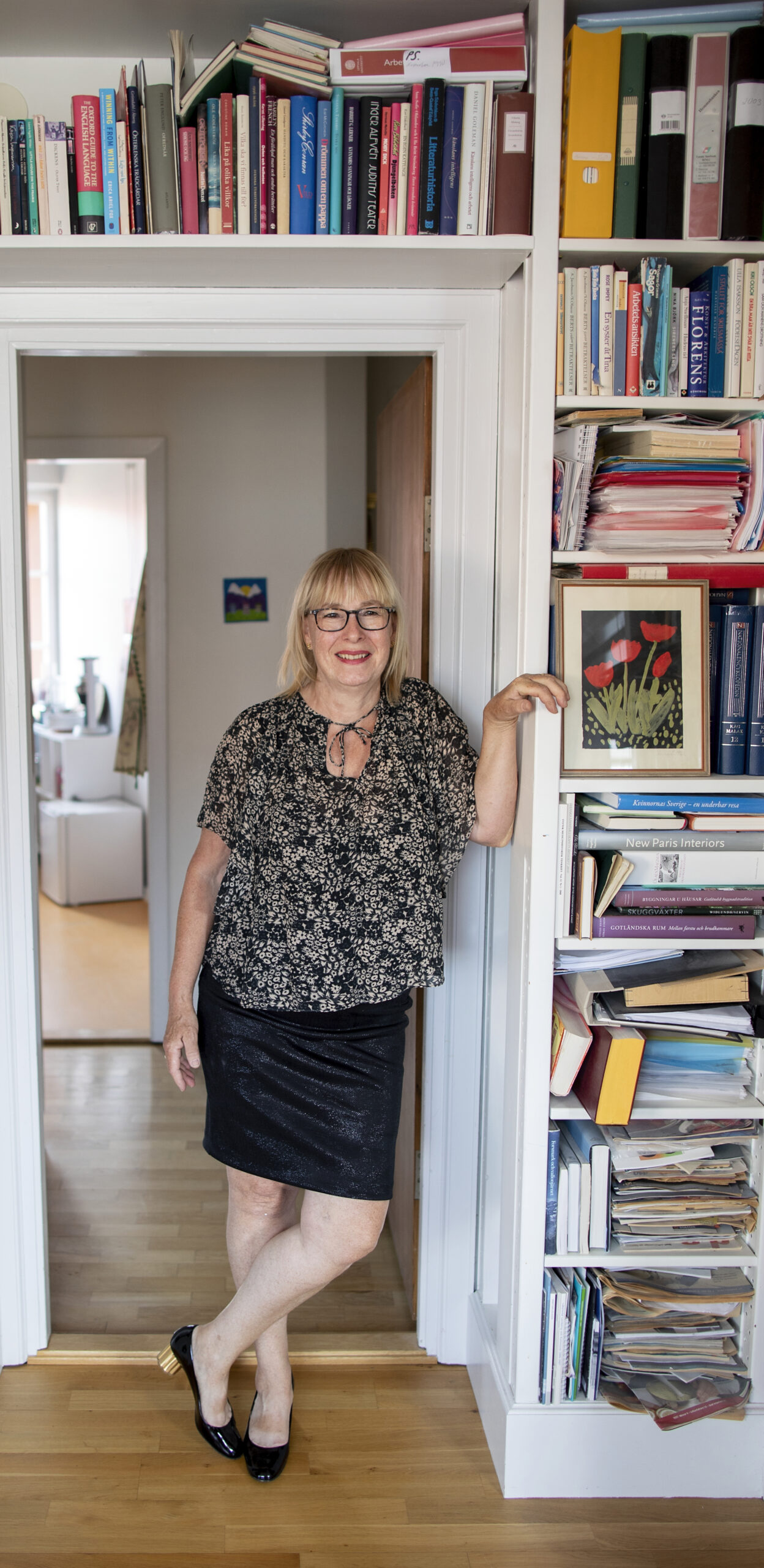 Biblioteket fungerar sedan i juni som hemmakontor. I och med att hon bor på egen hand är det inte svårt att få arbetsro. Hennes dotter och två söner är sedan länge utflugna. Rummet har emellertid i praktiken varit kontor under många år (”det är lättare att ha inte minst det fackliga materialet hemma, så att jag snabbt kan få tillgång till det”).