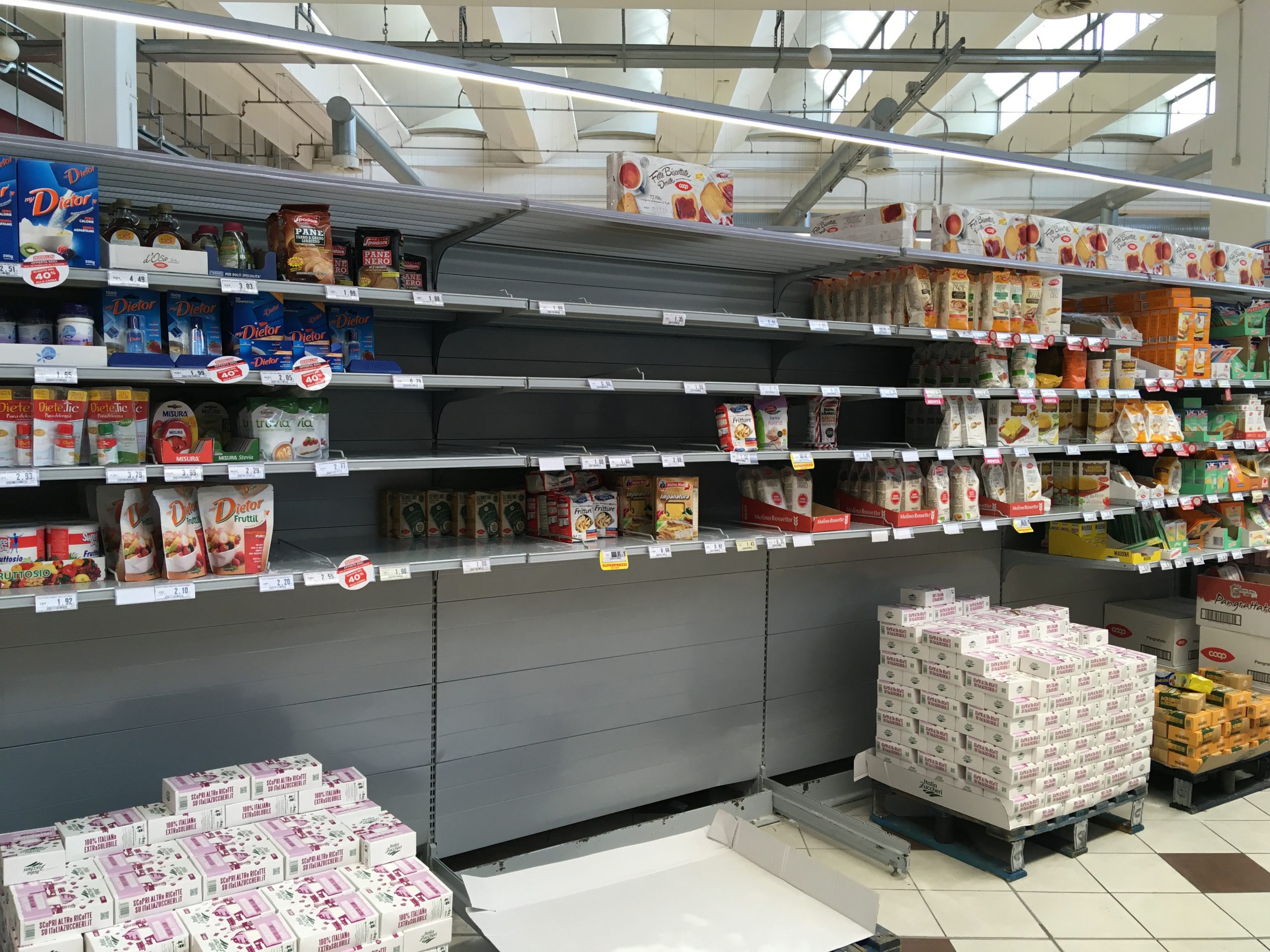 Rean på outlet, som normalt sett innebär en timmes väntan på parkeringsplats och vassa armbågar för att komma in i affärerna, visade sig vara nästan folktom. Däremot fick jag en chock när jag kom till mataffären dagen efter det första fallet registrerats i Florens. Det var som värsta lördagsruschen, och när jag kom fram till mjölet fanns inte ett enda litet paket kvar. Samma med pastan. Rädslan för karantän fick folk att hamstra basvaror. Svärmor, som varit med om andra världskriget, hävdar att hon aldrig sett något liknande.