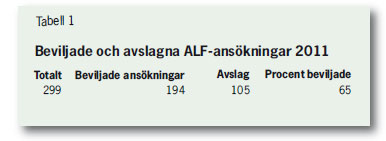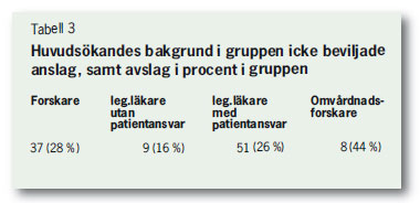 Här framgår att avslagsfrekvensen var lika hög bland forskare som läkare med patientansvar, medan den var lägre för läkare utan patientansvar och mycket hög för omvårdnadsforskare.