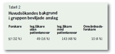 Huvudsökandes bakgrund framgår av tabell 2. Jag har valt att beteckna en grupp som forskare, även om detta kan vara ett oegentligt namn. I detta sammanhang betecknar det en forskare med grundutbildning utanför läkarprogrammet som bedriver klinisk eller klinisk experimentell forskning ofta på heltid.