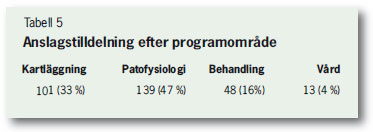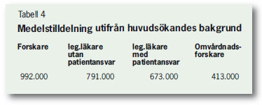 Av tabell 4 framgår att kategorin ”forskare” får störst medelstilldelning följt av ”läkare utan patientansvar”, tätt följt av ”läkare med patientansvar”, medan ”omvårdnadsforskare” fick lägst medelstilldelning.