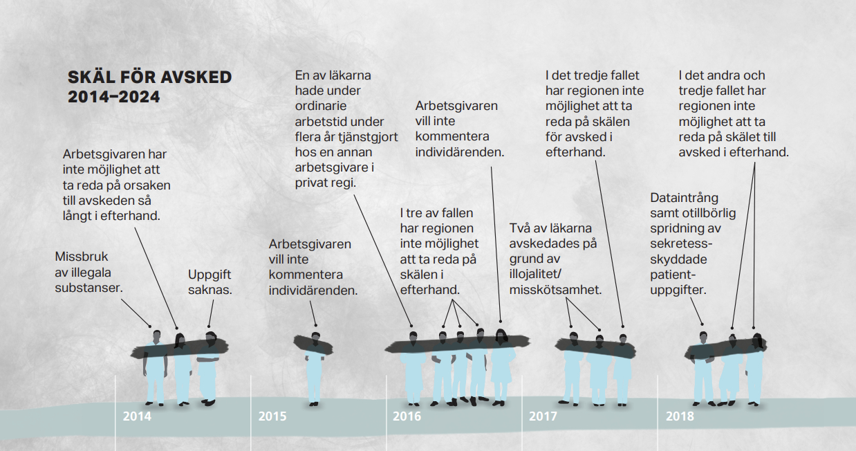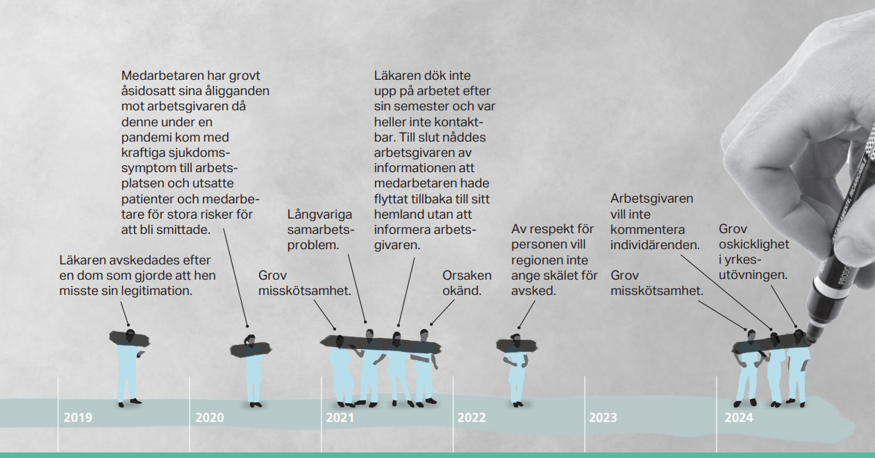 Misskötsam, illojalitet och samarbetsproblem. Det är några av orsakerna som arbetsgivaren anger till att läkare har avskedats från sina tjänster på sjukhusen i landets regioner de senaste tio åren. Extra mycket uppmärksamhet har fallet med överläkaren och förlossningschefen Karin Pettersson fått, som i februari blev avskedad från Karolinska på grund av det som arbetsgivaren beskrev som grov illojalitet. Detta efter att hon bland annat hade använt sin arbetsmejl i privata sammanhang och inte anmält sina bisysslor till arbetsgivaren på rätt sätt.