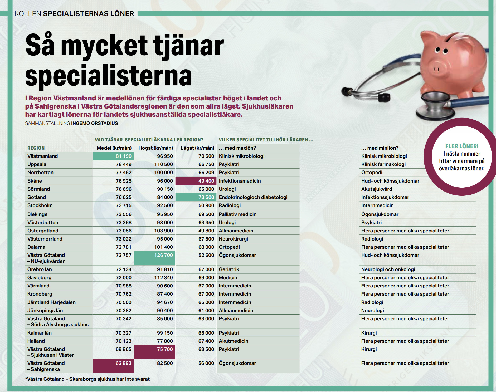 I Region Västmanland är medellönen för färdiga specialister högst i landet och på Sahlgrenska i Västra Götalandsregionen är den som allra lägst. Sjukhusläkaren har kartlagt lönerna för landets sjukhusanställda specialister.