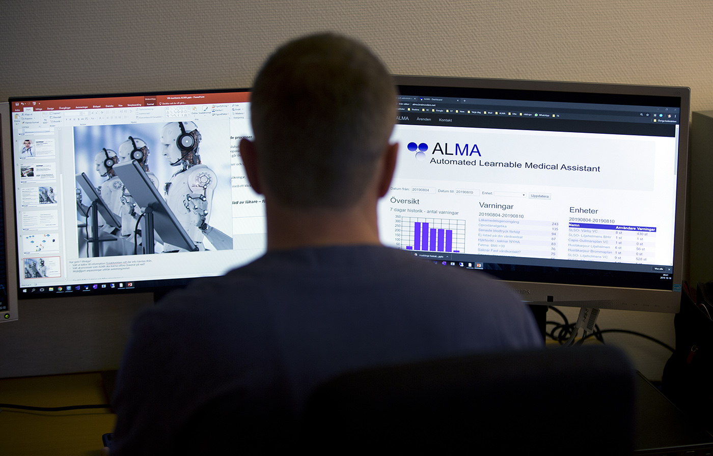 Den digitala läkarassistenten Alma varnar, påminner och underlättar arbetet för läkare, inte minst genom att leta efter potentiellt farliga kombinationer hos en patients diagnoser, provsvar, mätvärden och läkemedel i patientens elektroniska journal. Under hösten ska systemet, som kommer från professionshåll och initialt är utvecklat för primärvården, testas på Danderyds sjukhus.