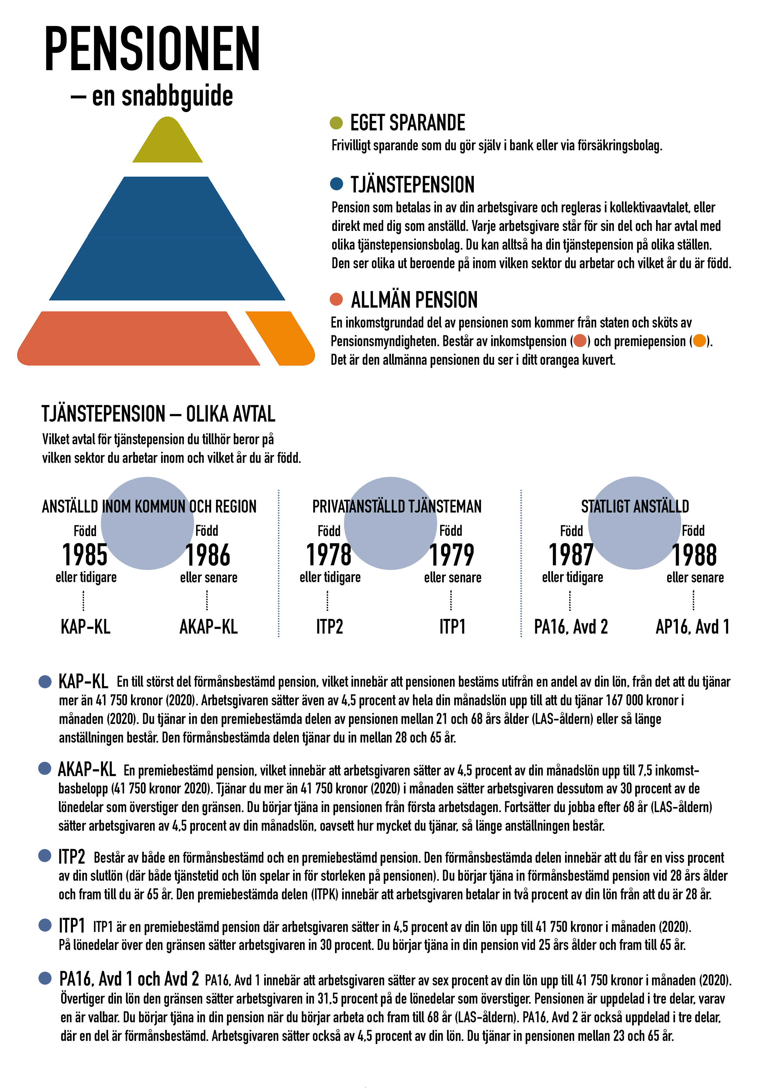 Eftersom tjänstepensionen är den del som har störst betydelse för de flesta läkare är det också där du kan göra störst skillnad. Merparten av Sjukhusläkarnas medlemmar omfattas av tjänstepensionsavtalet KAP-KL – det vill säga det avtal som gäller för dig som arbetar inom kommun- och regionsektorn och är född 1985 eller tidigare. 1998-2005 hette avtalet PFA och innan dess PA-KL.