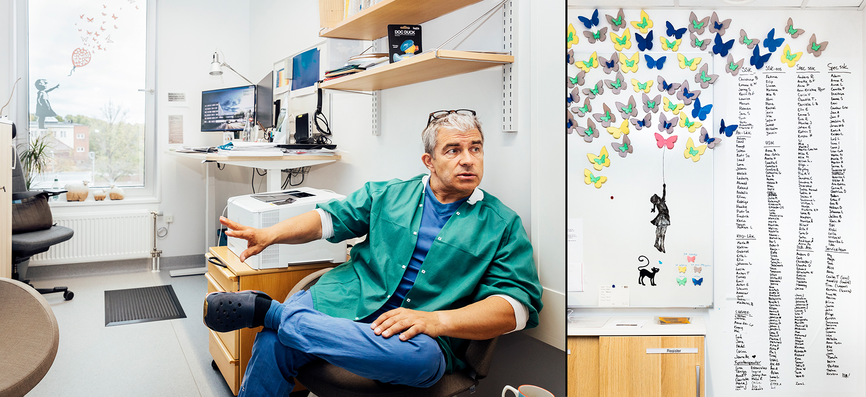 Inne i Håkan Kalzéns arbetsrum syns fjärilar av olika slag. Även inne på en av väggarna på IVA hänger en hel svärm i olika färger. Var och en symboliserar en intensivvårdad covid-patient. Färgen hur det gått för dem. ”Vi behövde en symbol för att visualisera vad som pågick. Och en fjäril kan symbolisera så mycket olika för människor”, säger Håkan Kalzén. Foto: Beatrice Graalheim