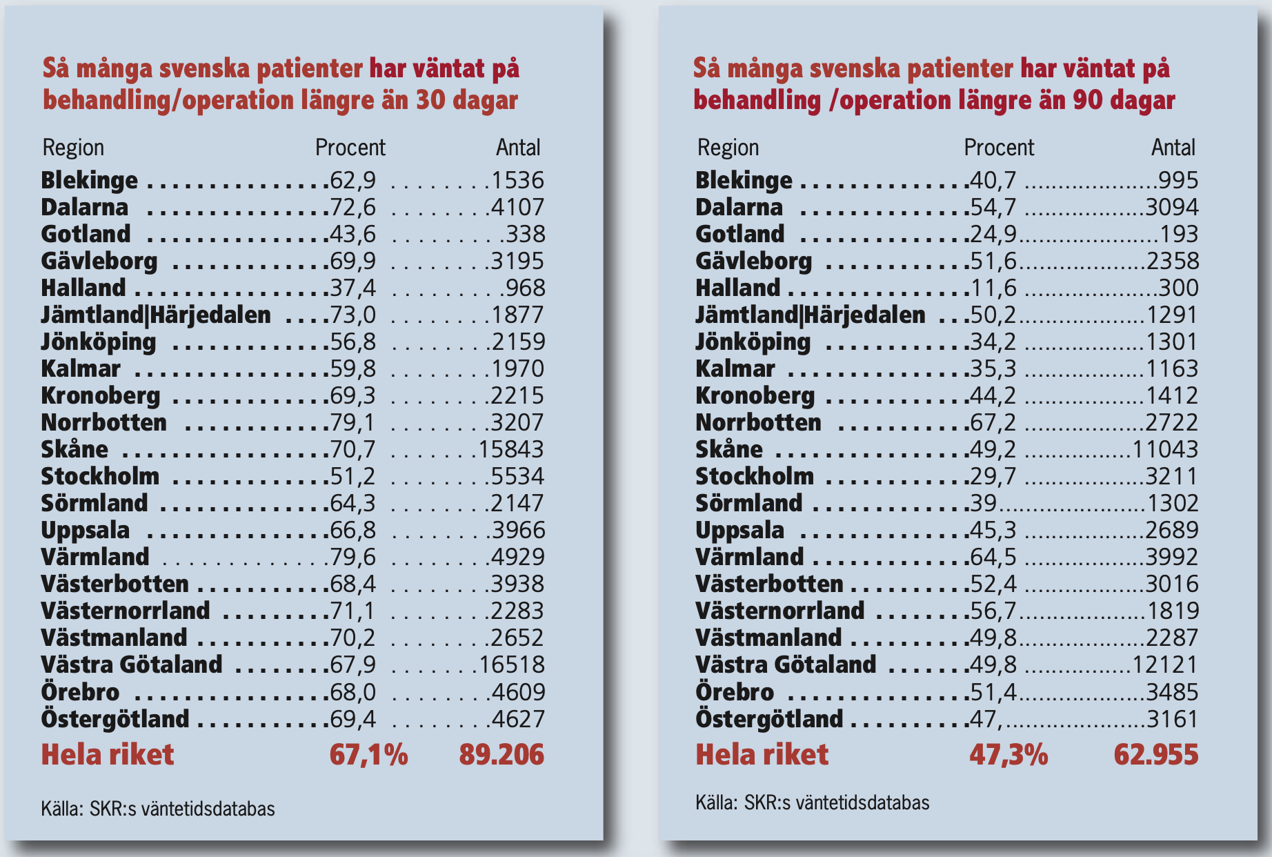 I Värmland väntade i september fler patienter över 90 dagar (3992) än i Stockholm (3211). Och bor man i Norrland kan man glömma snabb vård. Där får bara 20-30 procent behandling inom 30 dagar och i Norrbotten väntar två av tre längre än 90 dagar.