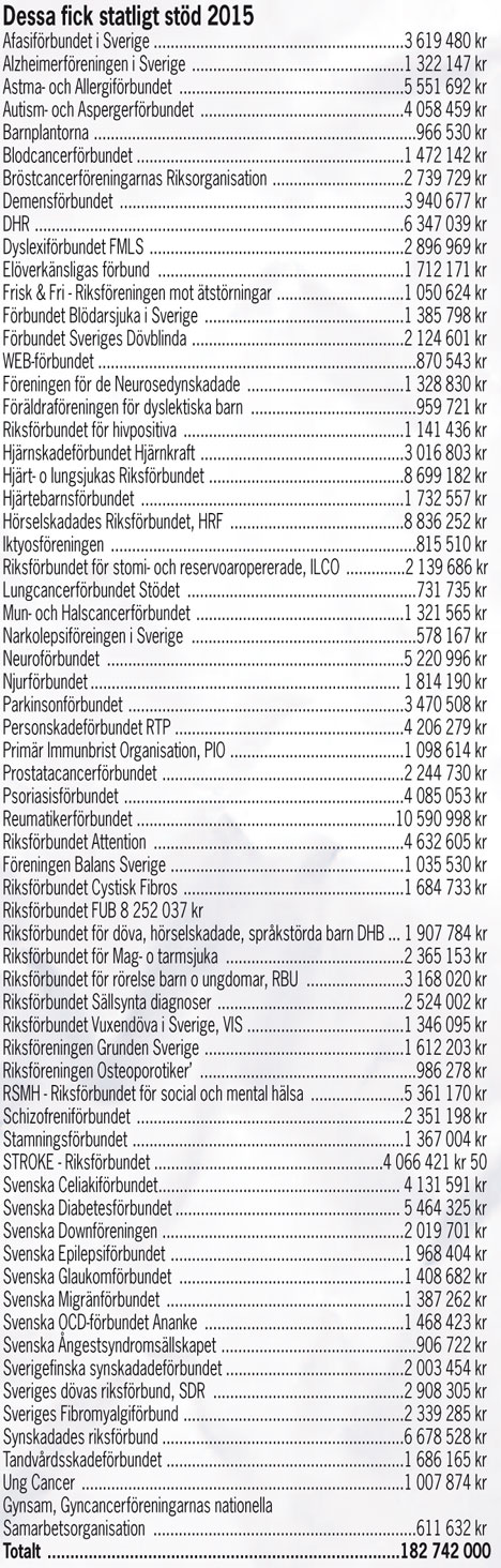 Alla omkring 40 förbund som är medlemmar i paraplyorganisationen Handikapporganisationerna, HSO, fick bidrag 2015. Men även andra kan få stöd, till exempel fick Synskadades riksförbund 6 678 528 kronor.