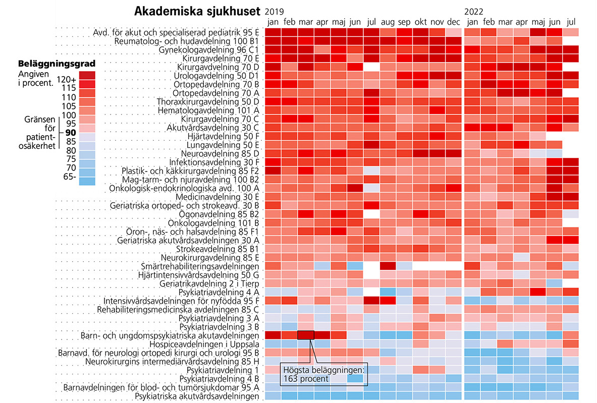 Enligt SKR:s statistik över beläggningsgrader 2019, klarar sig Region Uppsala bättre än de flesta av landets regioner med siffran 87 procent. Men på Infektion 30F har beläggningsgraden gått från 102 procent i januari 2022 till 121 i juli. Mia Furebring är överläkare där och djupt oroad över situationen.